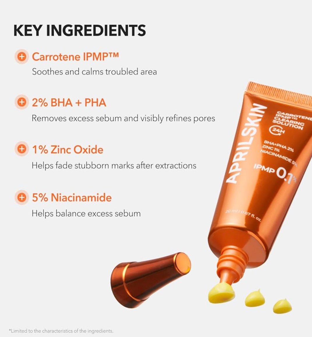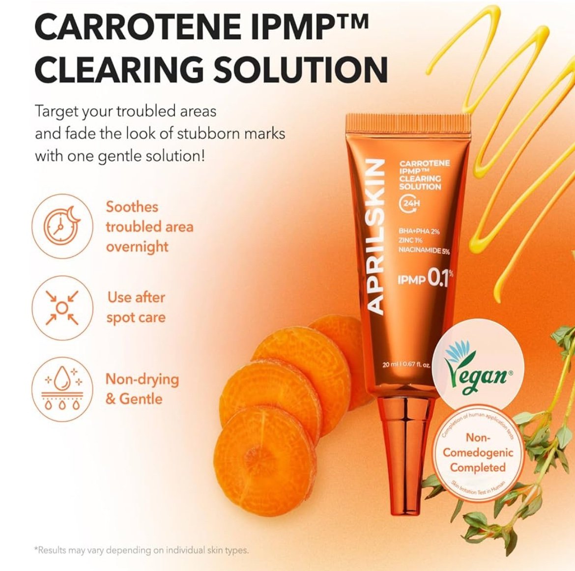Apply a small amount of APRILSKIN Carrotene IPMP Clearing Solution to troubled areas of the skin after cleansing and toning. Use it as a spot treatment or all over the face as needed. For best results, use twice daily, morning and night. Follow with moisturizer and sunscreen during the day.