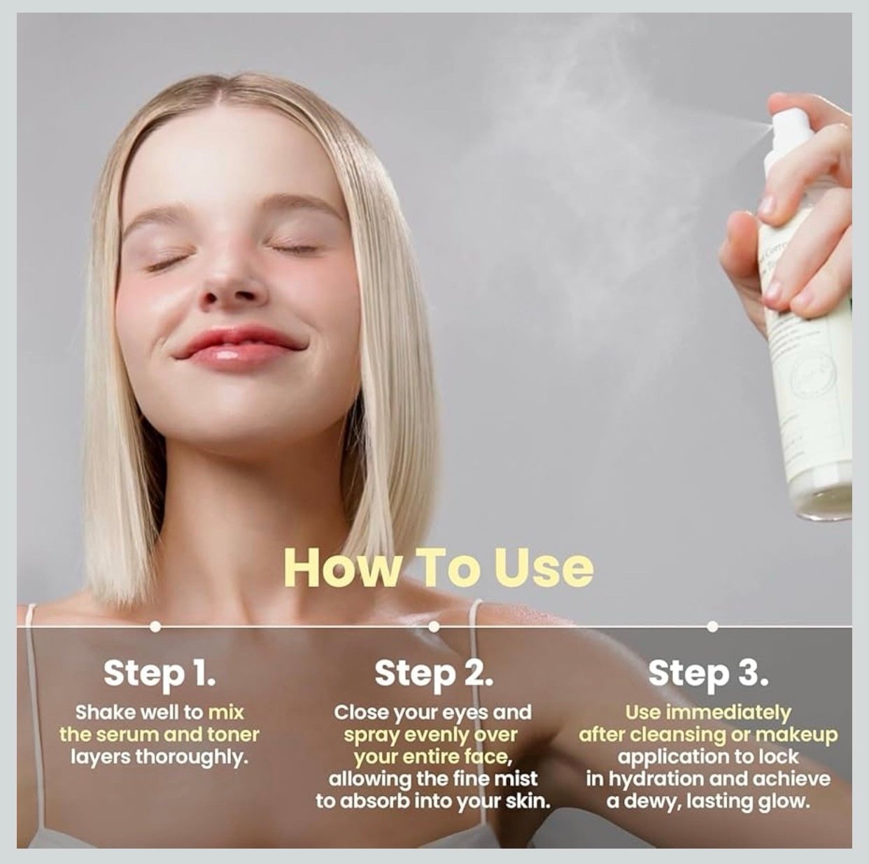 3. استخدميه مباشرةً بعد تنظيف البشرة أو وضع المكياج للحفاظ على ترطيبها والحصول على إشراقة ندية تدوم طويلًا.