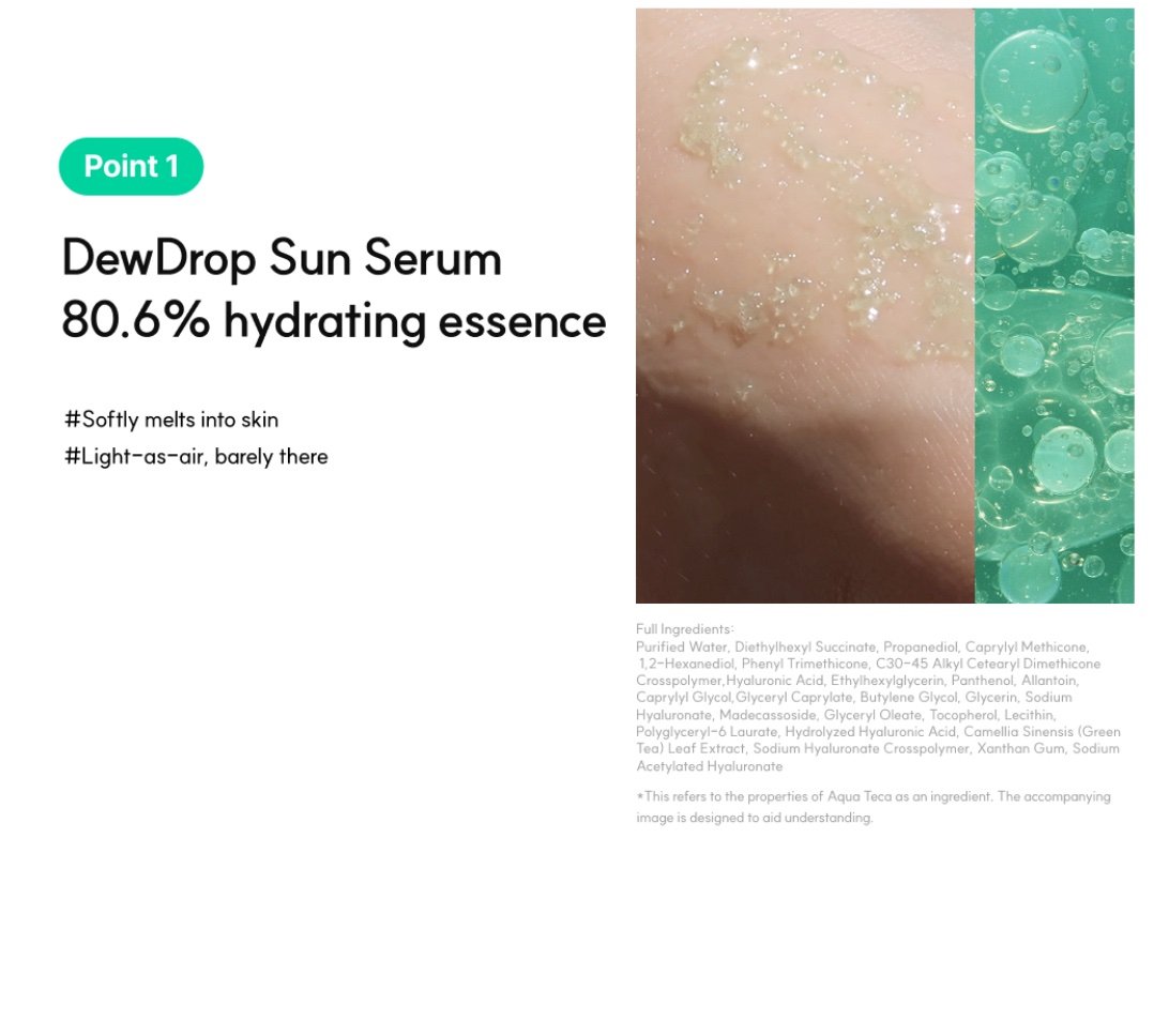 مع عامل حماية من الشمس SPF50+ PA++++، يحمي بشرتكِ بفعالية من أشعة الشمس الضارة مع الحفاظ على ملمس خفيف وجيد التهوية. غني بخلاصة ترطيب 80% وزيت تيكا، المعروف بخصائصه المهدئة، يرطب البشرة ويهدئها.