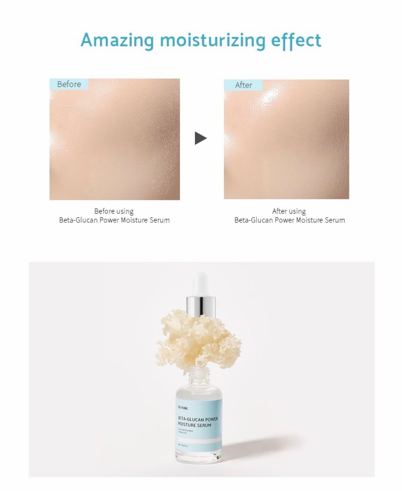 ترطيب يدوم طوال اليوم: سيروم الترطيب IUNIK بيتا جلوكان مُصمم بتركيبة غنية بـ 400,000 جزء في المليون من بيتا جلوكان ومستخلص خميرة الفطر.