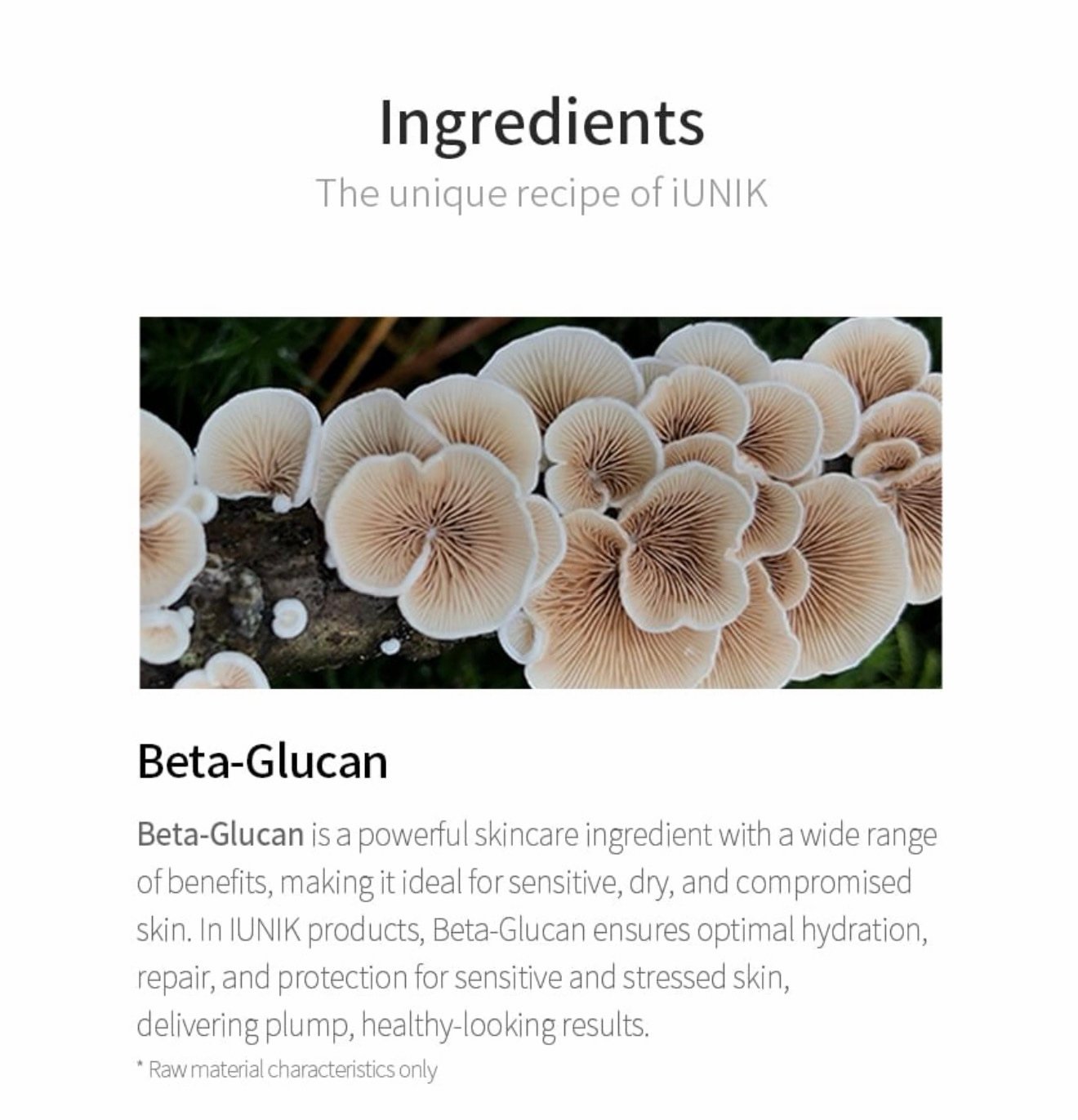 KEY INGREDIENT: BETA-GLUCAN. Beta-glucan is a natural polymer polysaccharide extracted from the wall of mushroom yeast table. It has a 20% higher moisture capacitance than hyaluronic acid; it improves skin elasticity.