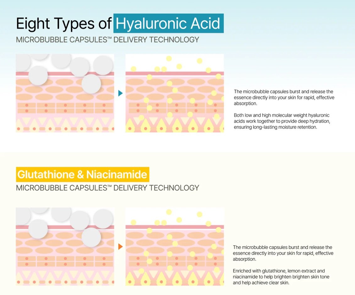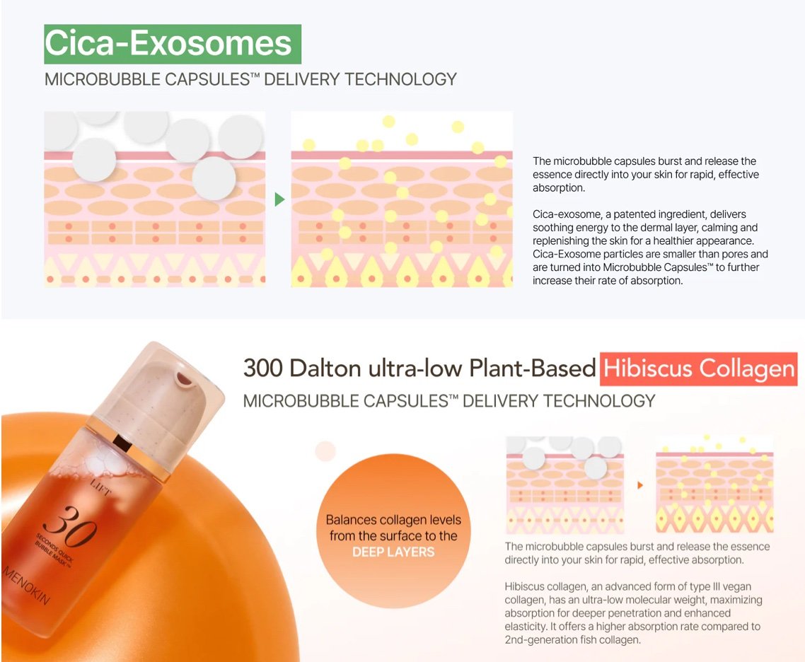 Patented! 30 Seconds Quick Biubble Mask: Essence penetrates directly with Micro Bubble Capsule technology. Non-Greasy and Non-sticky collagen bubble.
