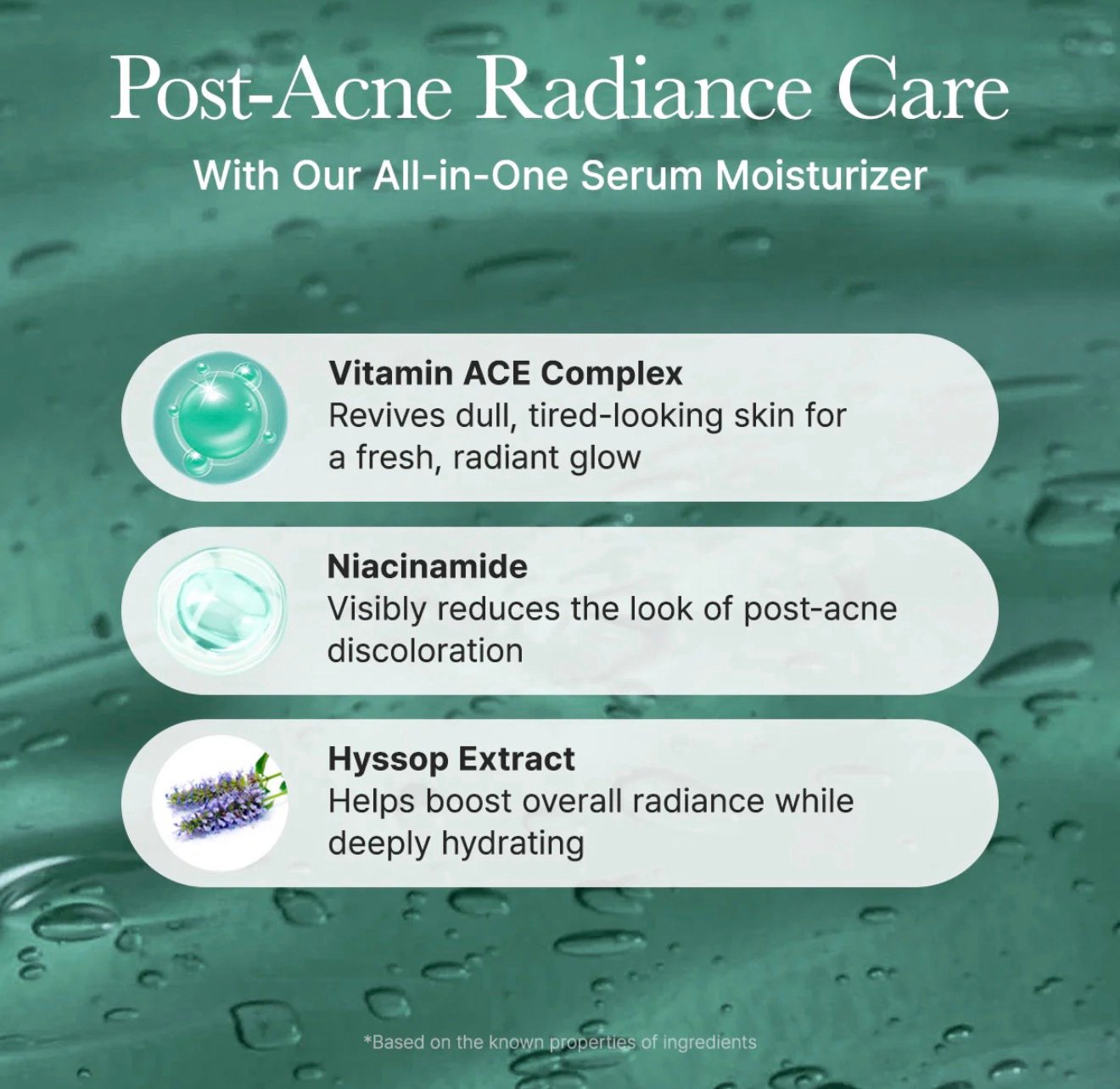 غني بالببتيدات والنياسيناميد ومستخلص الزوفا، يرطب البشرة بعمق ويغذيها.