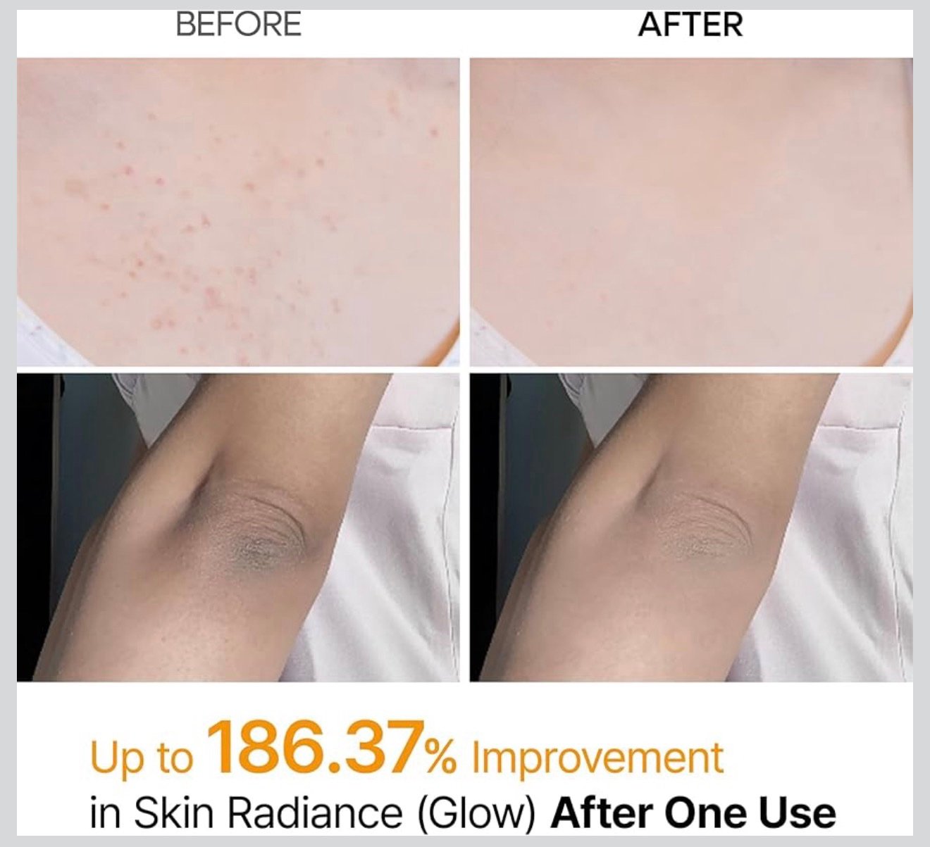 Kojic Acid, Retinol, Glutathione, Niacinamide and Vitamin B, C, E Complex brighten skin tone and restore skin radiance.