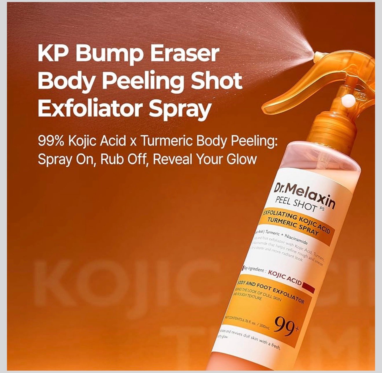 The Dr. Melaxin Peel Shot Exfoliating Kojic Acid Turmeric Spray is a powerful yet gentle exfoliating spray designed to refine skin texture, brighten uneven tone, and reveal a radiant, smooth complexion from head to toe.