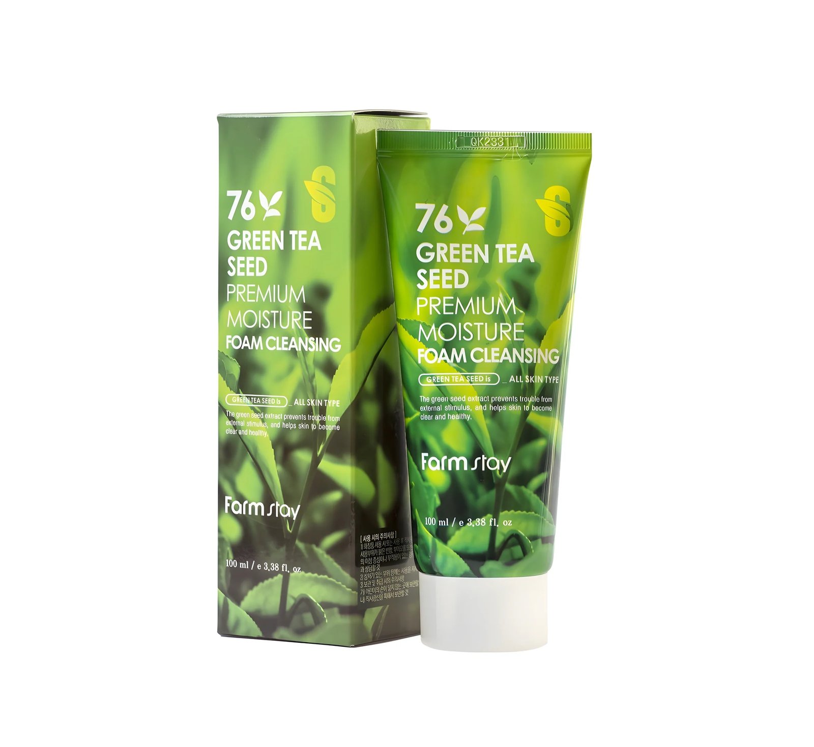 Farmstay Green Tea Seed Premium Moisture Foam Cleanser 100ml غسول رغوي مرطب فاخر من بذور الشاي الأخضر لمكافحة حب الشباب وتنظيف المسام من فارمستاي