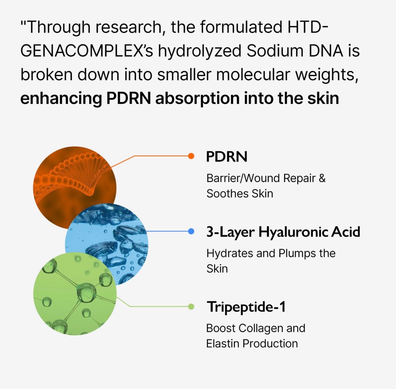 Powered by HTD-GENACOMPLEX™, a unique patented complex made with Salmon DNA, triple-layer Hyaluronic Acid, and Tripeptide-1, this advanced formula works to dramatically enhance skin elasticity, plumpness, and overall radiance.