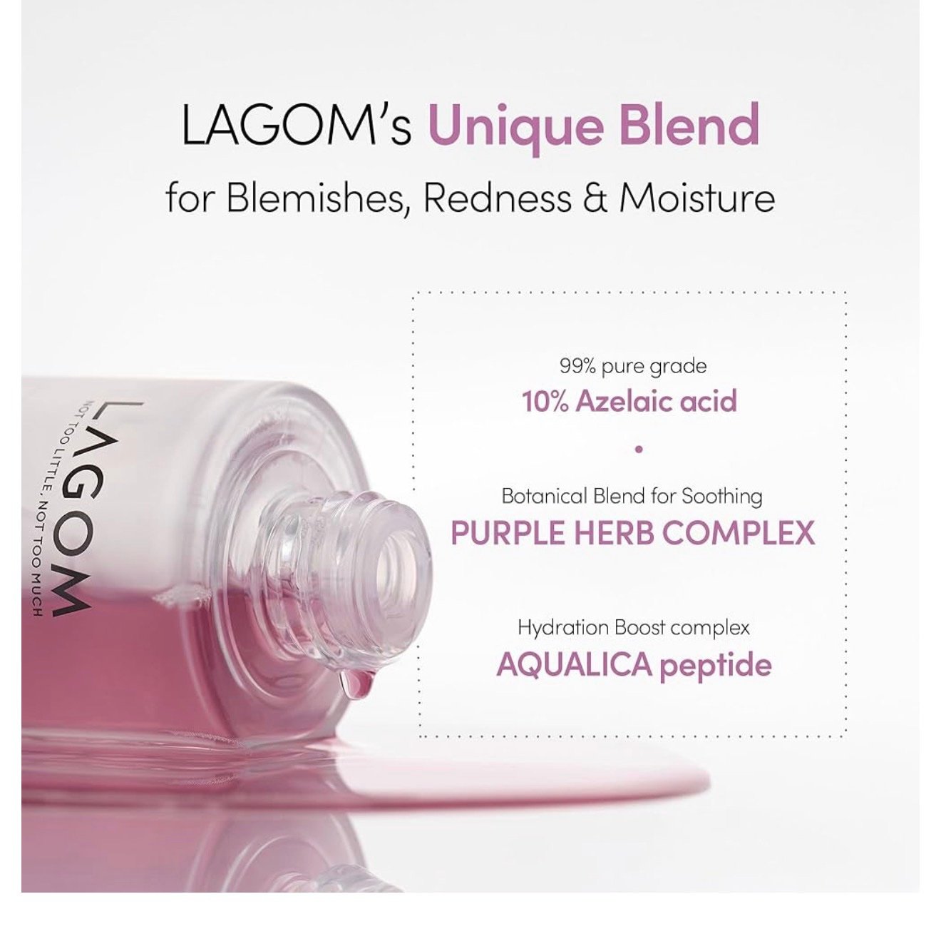 تركيبة غنية بحمض الأزيليك عالي النقاء بنسبة 99%، ومركب الأعشاب الثلاثة، ومستخلص أكواليسيا®، يساعد هذا السيروم الخفيف على تهدئة البشرة الحساسة وإعادة توازنها، مع تنعيم ملمسها غير المتجانس الناتج عن الإفرازات الدهنية الزائدة، وظهور البثور، والاحمرار. يوفر السيروم البنفسجي تأثيرًا مهدئًا ومزيلًا للسموم ومنقيًا لبشرة أكثر نقاءً ونعومة وتوازنًا بشكل ملحوظ.