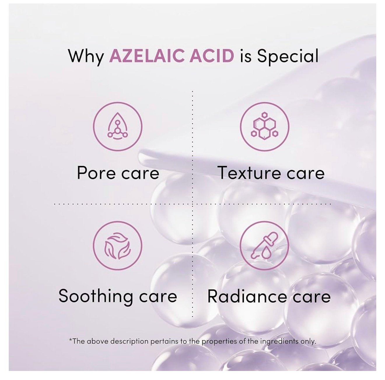 حمض الأزيليك عالي النقاء (99%): مكون مثبت سريريًا يقشر البشرة بلطف، ويقلل من الإفرازات الدهنية الزائدة، وينقي المسام، ويحسن البشرة المعرضة لحب الشباب دون تهيج.