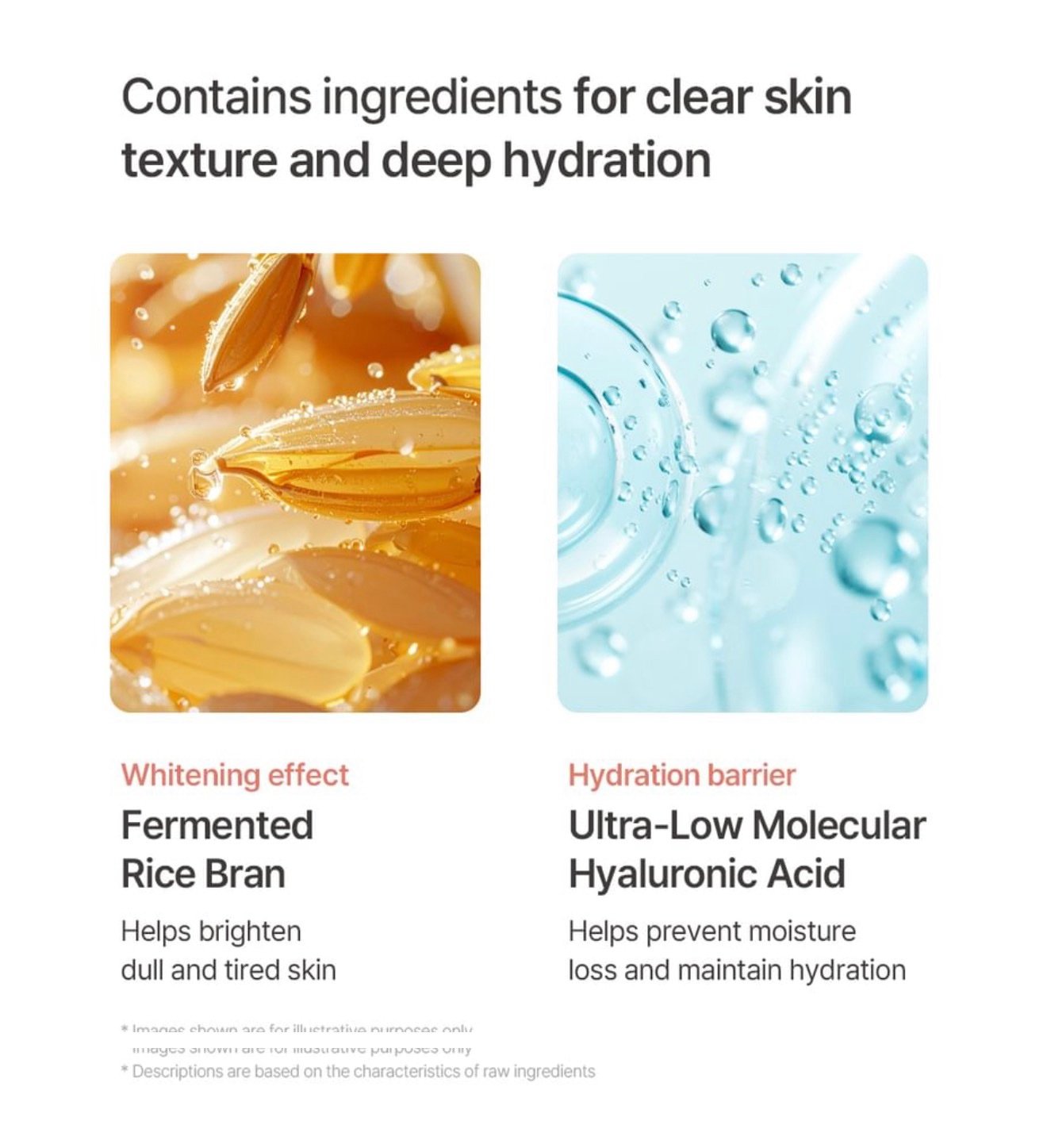 Infused with fermented Rice Bran and Ultra-low molecular Hyaluronic Acid to brighten the skin complexion while maintaining hydration.