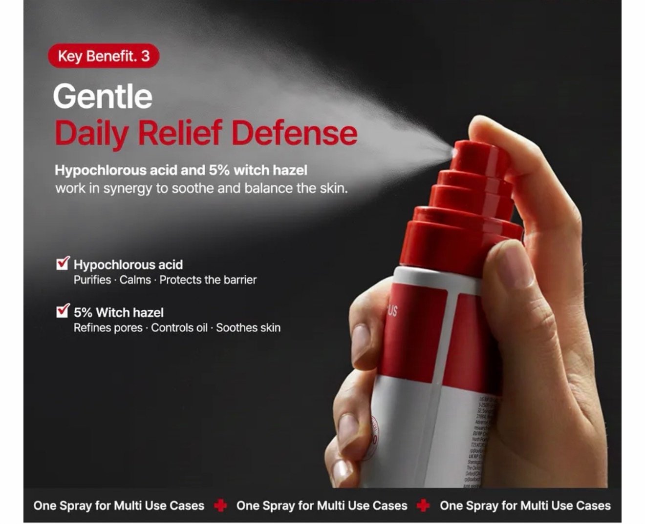 Hypochlorous Acid and 5% Witch Hazel work in synergy to soothe and balance the skin.