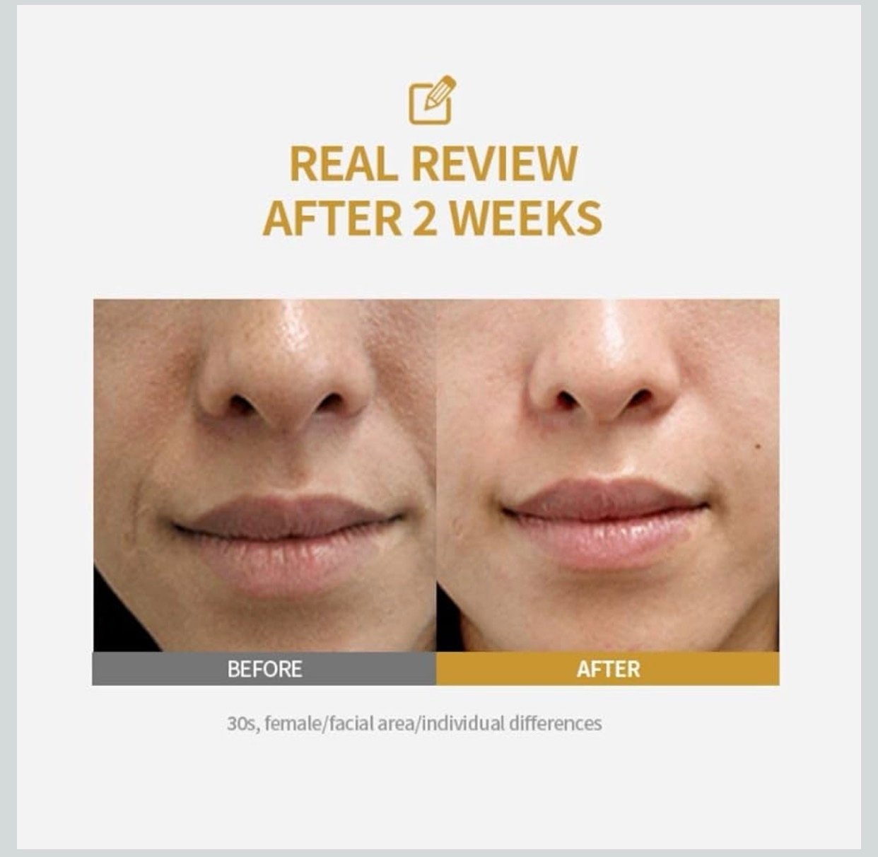 تأثير شد الجبين، ومنطقة العينين، والخد، وحافة الفم، والذقن، والتجويفات عند الاستخدام مرة واحدة.